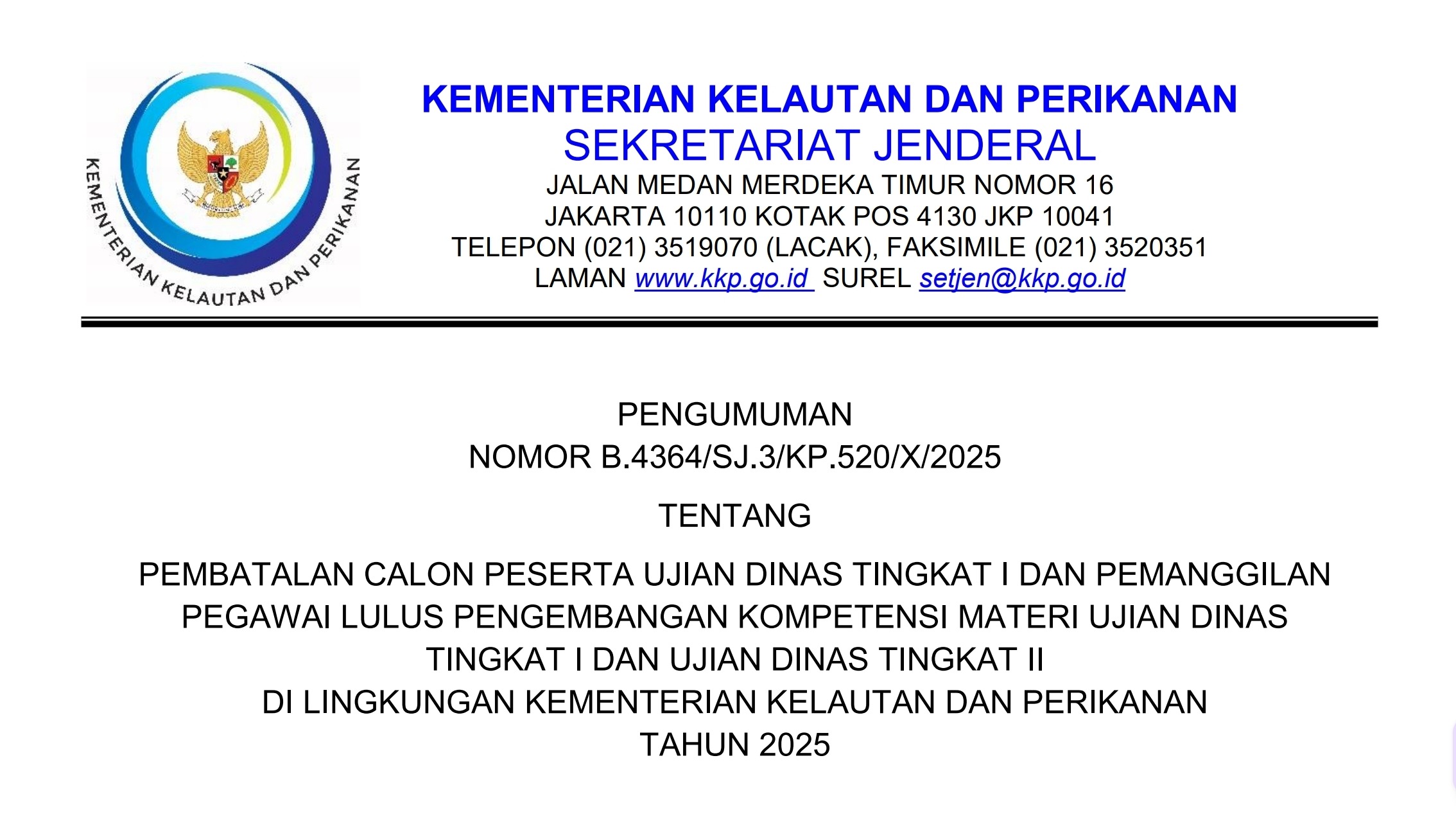 PEMBATALAN CALON PESERTA UJIAN DINAS TINGKAT I DAN PEMANGGILAN PEGAWAI LULUS PENGEMBANGAN KOMPETENSI MATERI UJIAN DINAS TINGKAT I DAN UJIAN DINAS TINGKAT II DI LINGKUNGAN KKP TAHUN 2025